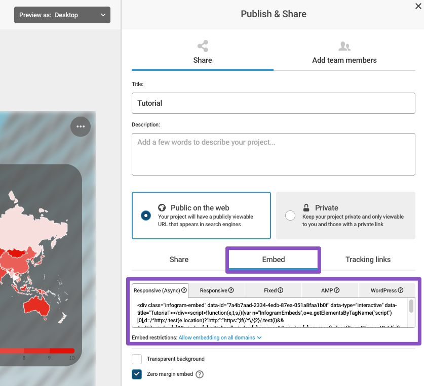 Projekte einzubetten ist eine hervorragende Art und Weise interaktive, visuelle Inhalte mit Ihrem Publikum zu teilen. Ihr Publikum wird mit hoher Wahrscheinlichkeit nicht nur auf Ihren Inhalt ansprechen, sondern auch mehr Zeit auf Ihrer Internetseite verbringen. Jedes Projekt hat seinen individuell generierten Einbettungscode.