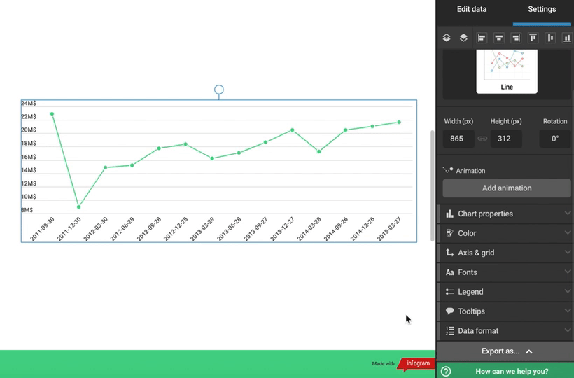 Infogram offers a variety of settings for customizing charts and displaying your data. Read through the article below to see how to adjust the chart axes, enable a zero baseline, adjust your line chart, as well as tailor the data format.