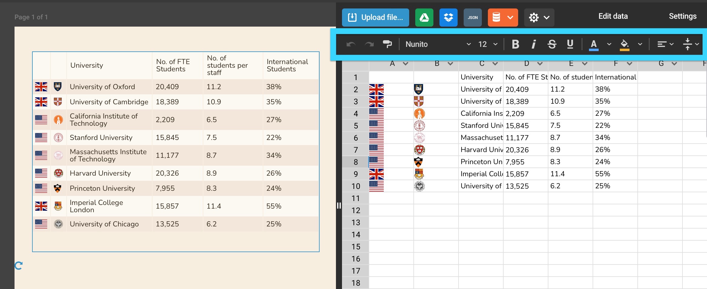 At the top of the data spreadsheet, you'll find a toolbar with the most popular text editing features, such as text and fill color, font size and style, horizontal and vertical text alignment, and bold, italic, underline, and striketrough styling.