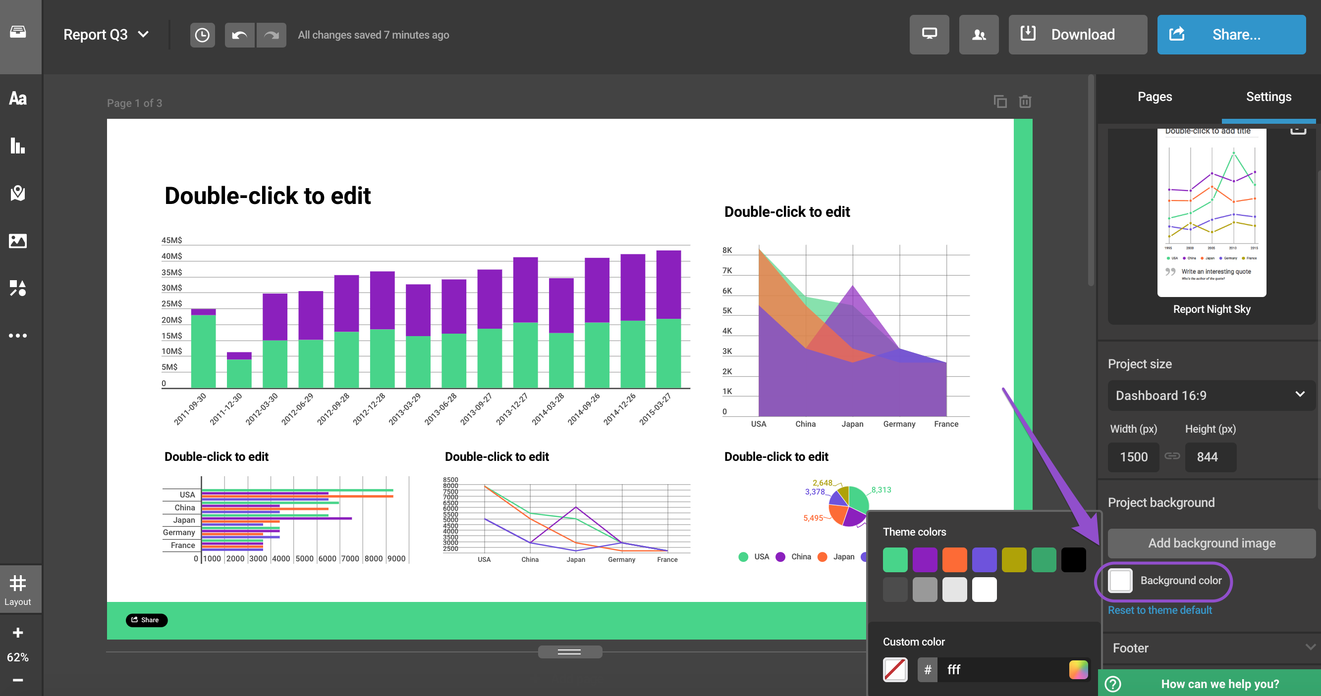 Modifier le fond de votre projet Infogram est très simple. il existe trois différentes options de fond parmi lesquelles choisir :