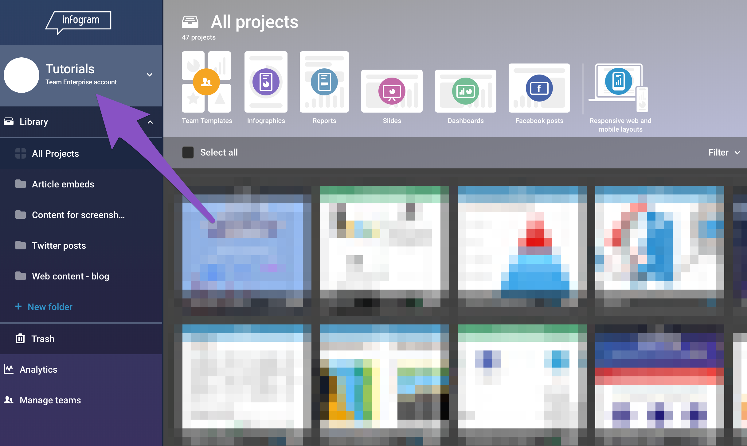 Une fois dans la bibliothèque , vous pouvez basculer entre votre compte personnel et votre compte d'équipe à tout moment depuis le coin supérieur gauche. Appréciez la collaboration avec Infogram !